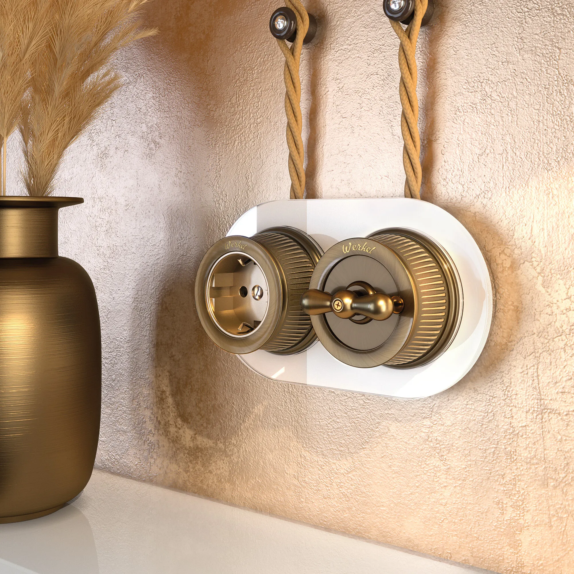 Гладкая стеклянная поверхность рамки отражает свет, создавая эффект глубины и объема, что делает ее идеальным фоном для декоративных элементов, таких как ретро переключатели и розетки. Рамка легко монтируется и совместима с различными моделями электроустановочных изделий из коллекций Werkel.